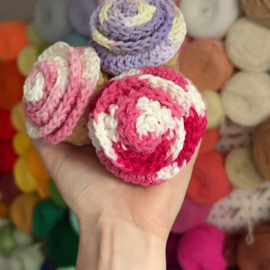 This soft, durable, and colourful crochet play food is the perfect addition to any play kitchen!
